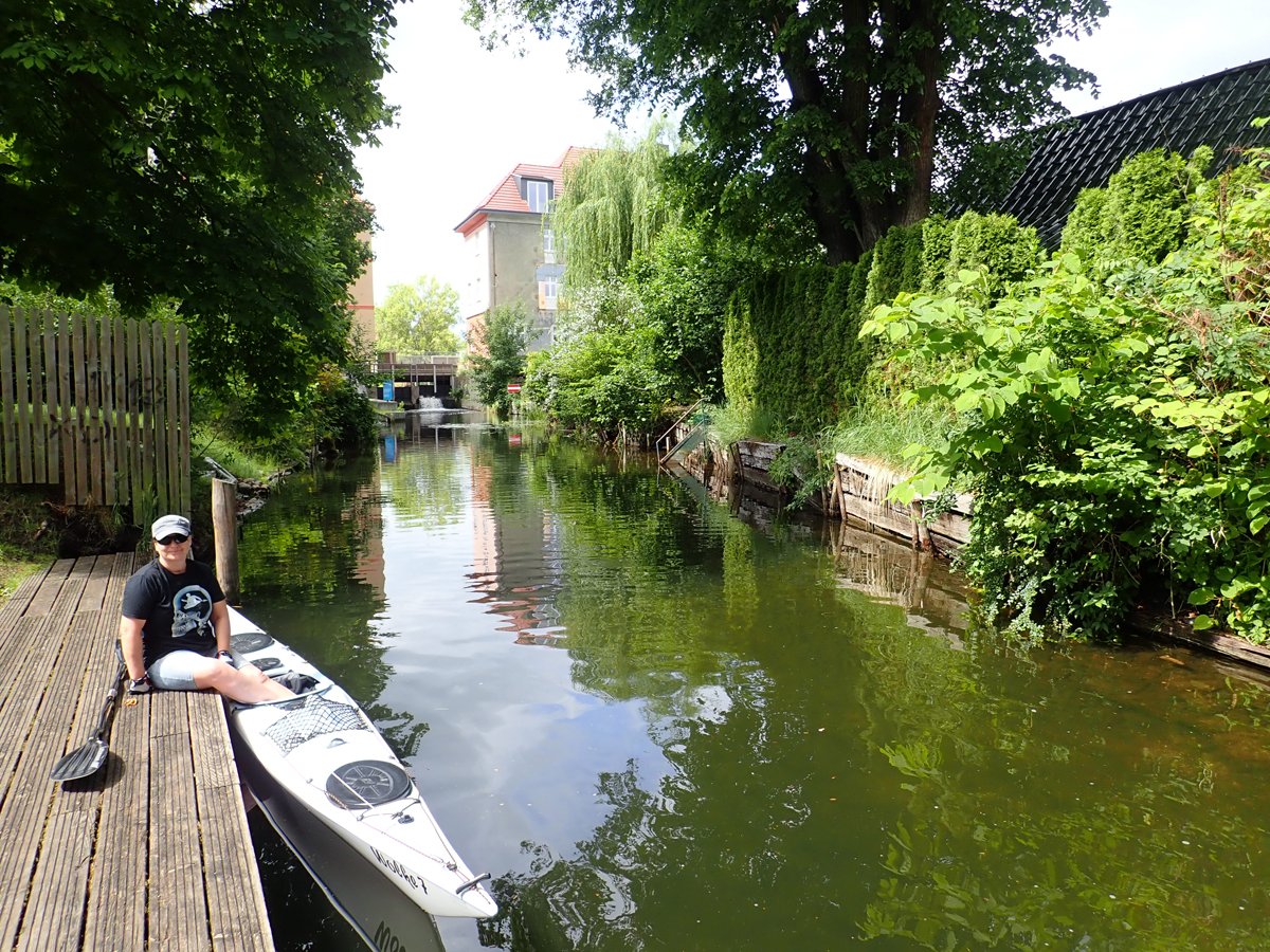 Der Start am nächsten Tag war am Wasserwanderrastplatz in Fürstenberg. Da wir die Stadt vom Wasser sehen wollten, nahmen wir nicht den kurzen Weg die Borstengasse des Wehres an der Einsetzstelle aufwärts, sondern in die andere Richtung durch den Ort. Bis zur SB-Schleuse Fürstenberg. Dort sollte uns der ansonsten lohnende Umweg fast eine Stunde Wartezeit kosten... Aber dann ging es weiter bis zu einem Flecken Land mit einer überdachten Holzbrücke und einer Verkaufsstelle eines örtlichen Fischers. Hier in Finow endete die Tour beim Fischbrötchen.
