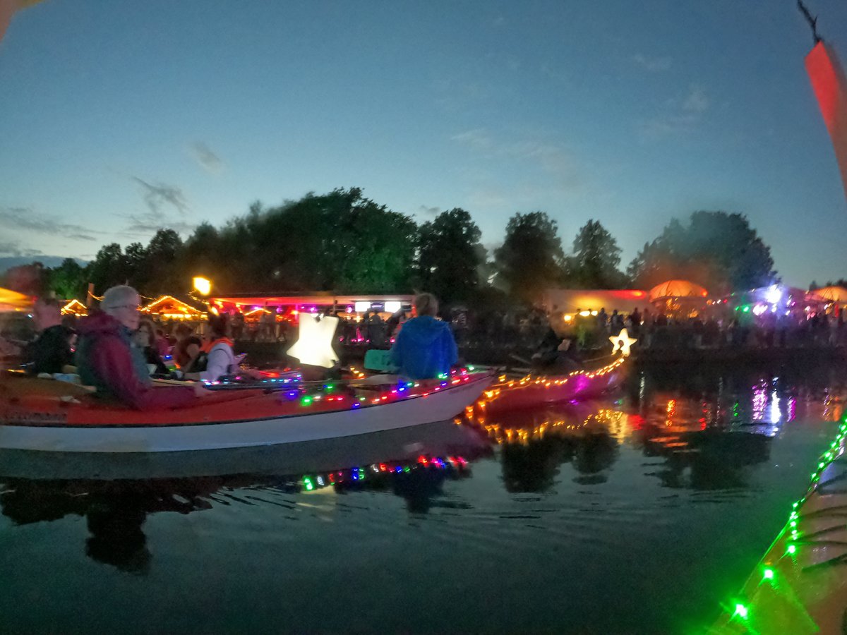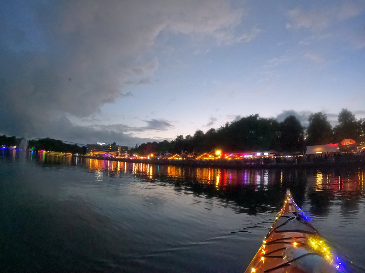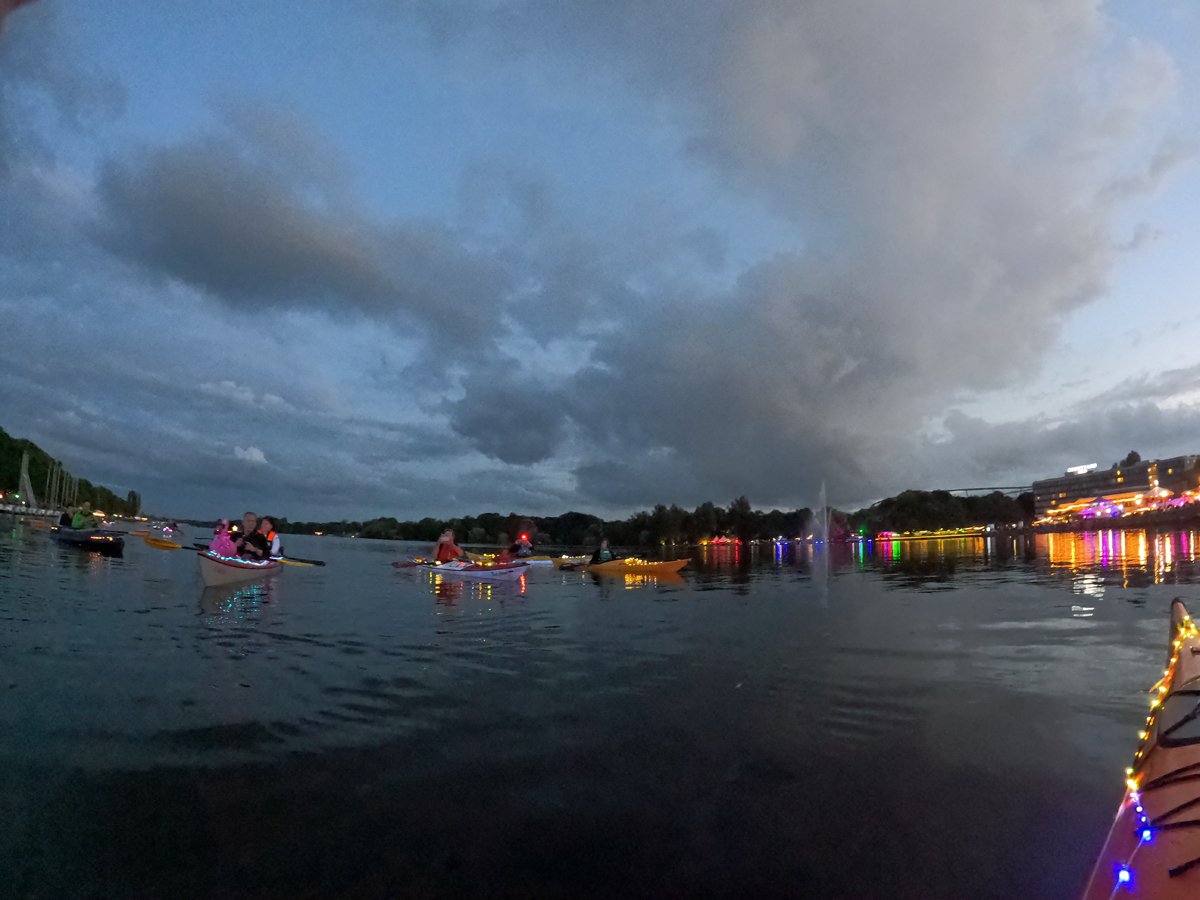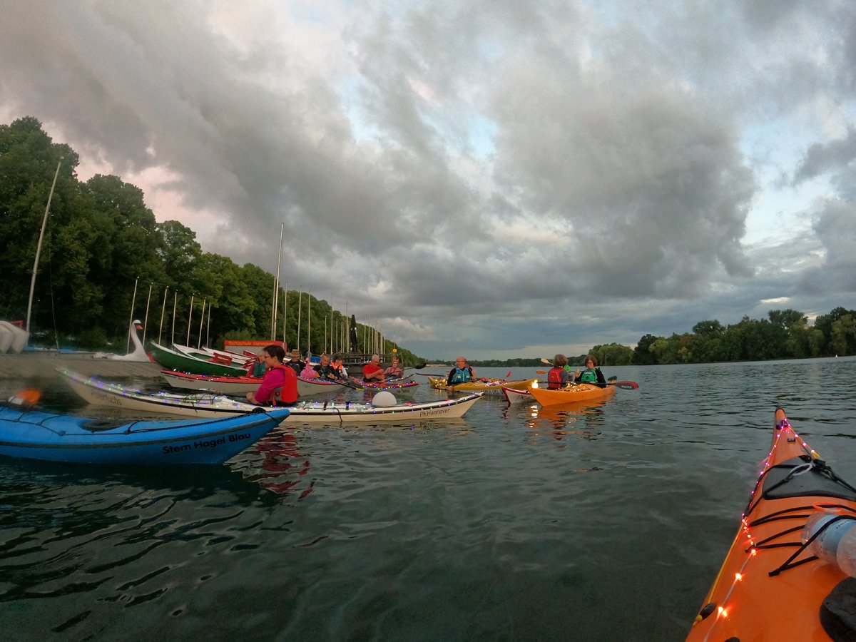 Immer wieder beliebt: Unsere Fahrt zum Maschseefest mit Kajaks. Die Besonderheit: Wir paddeln abends zum See und können das Vergnügen quasi aus erster Reihe geniessen. Nunja,. durhc unsere beleuchteten Boote gehört es aber auch dazu, dass wir gut gesehen werden. Nach einer Seerunde bei Livemusik geht es über die finstere Leine zum Bootshaus zurück.