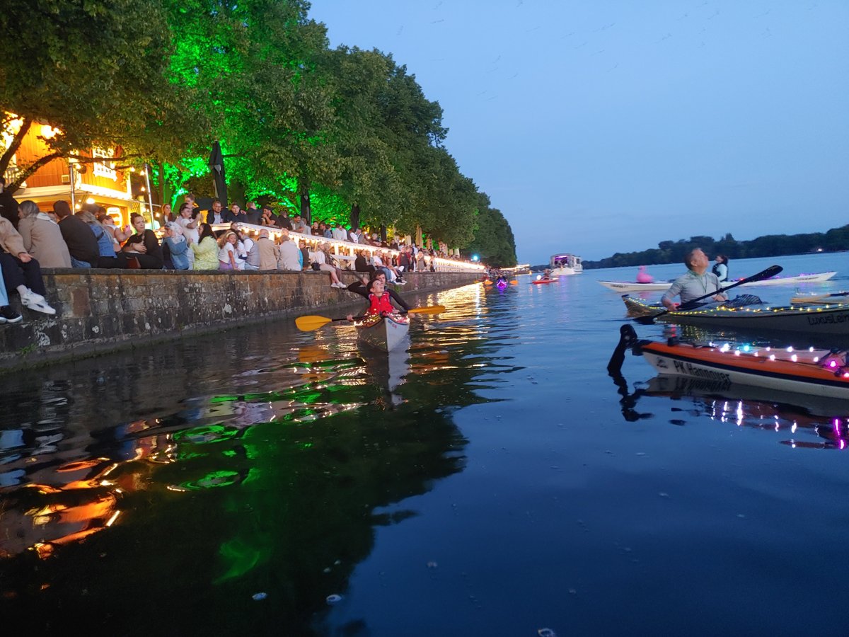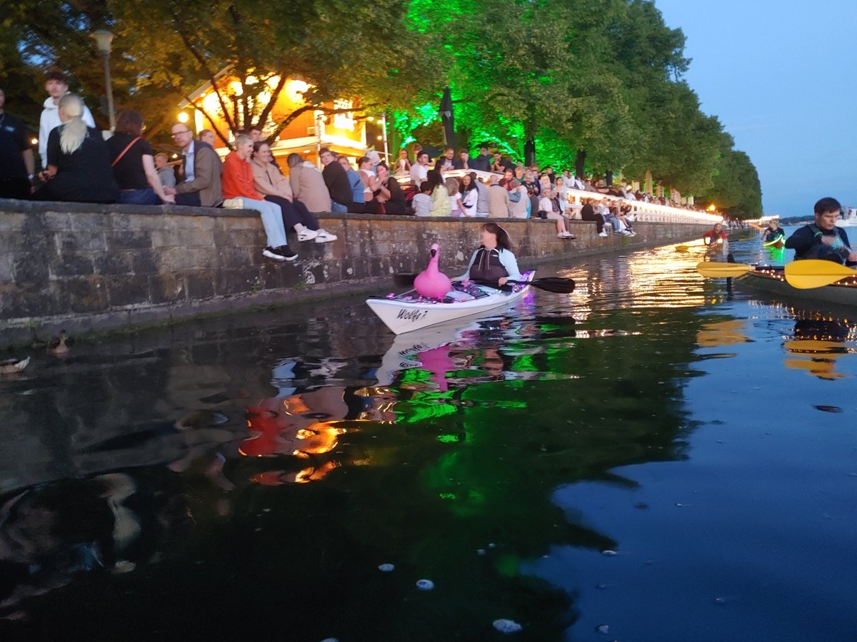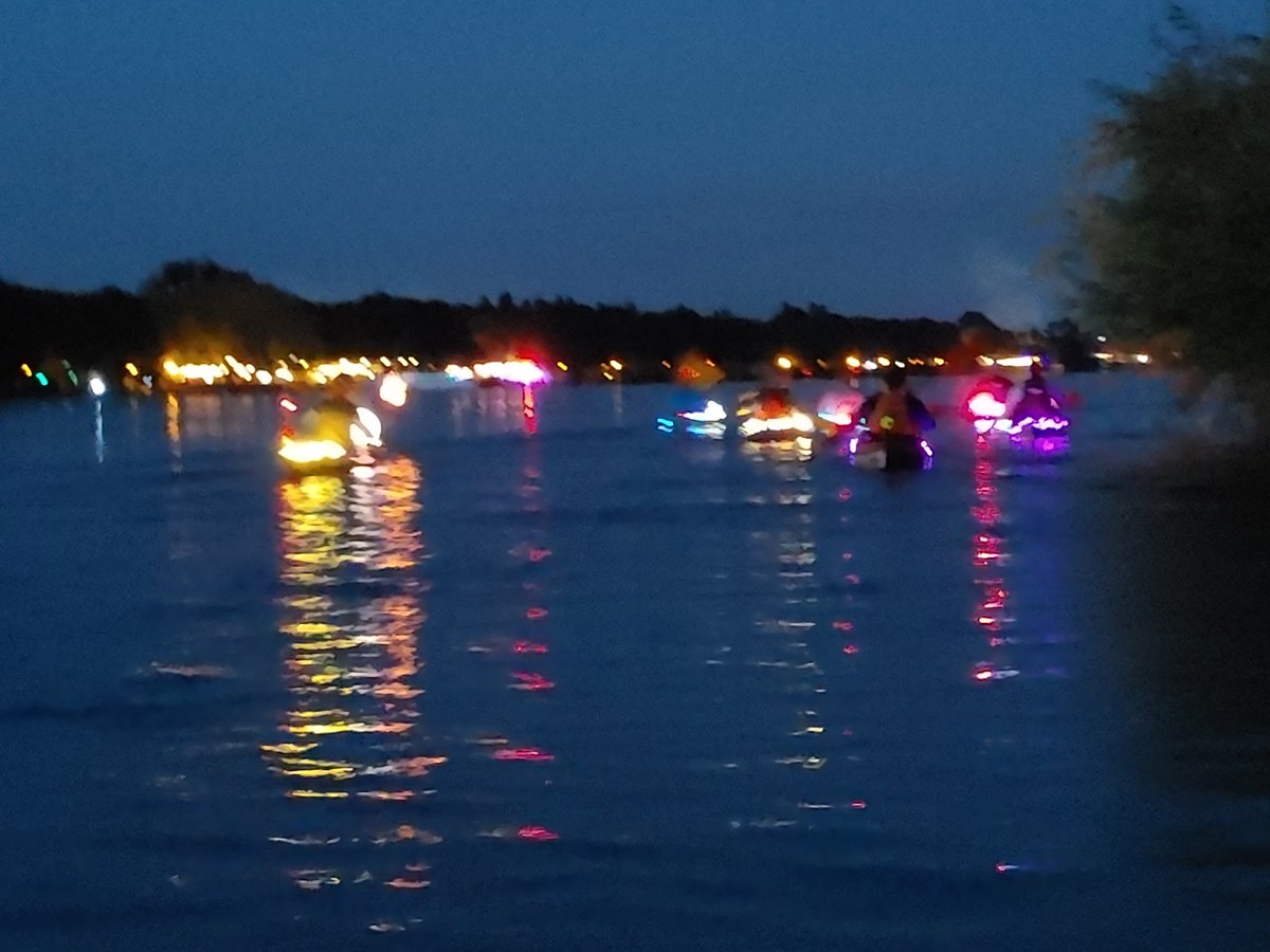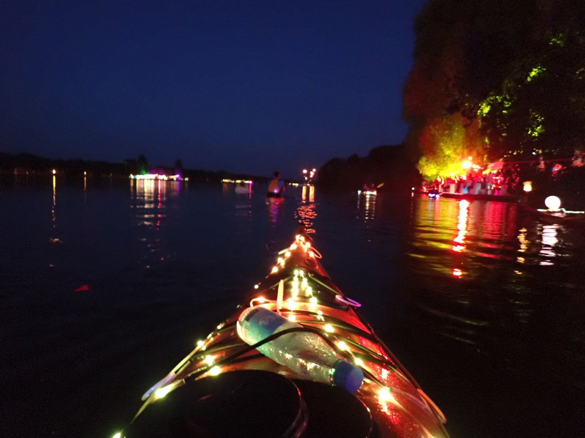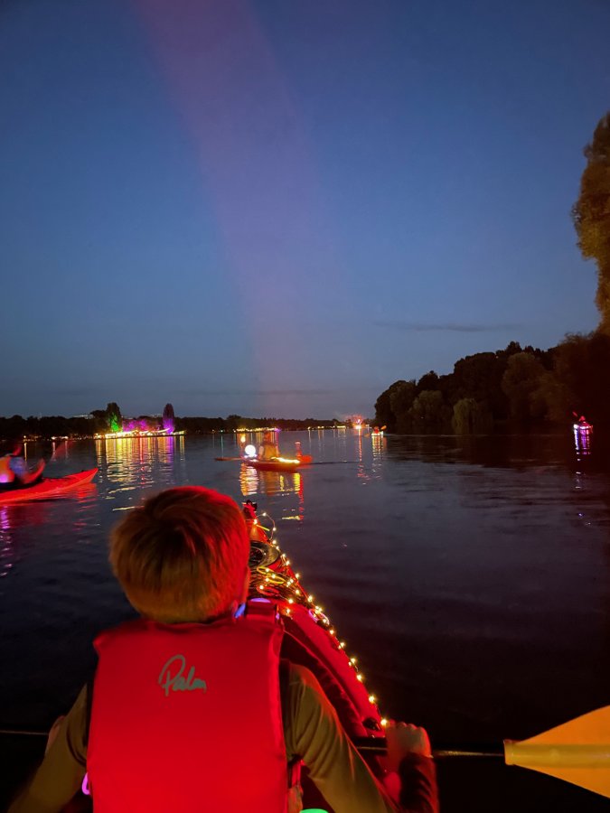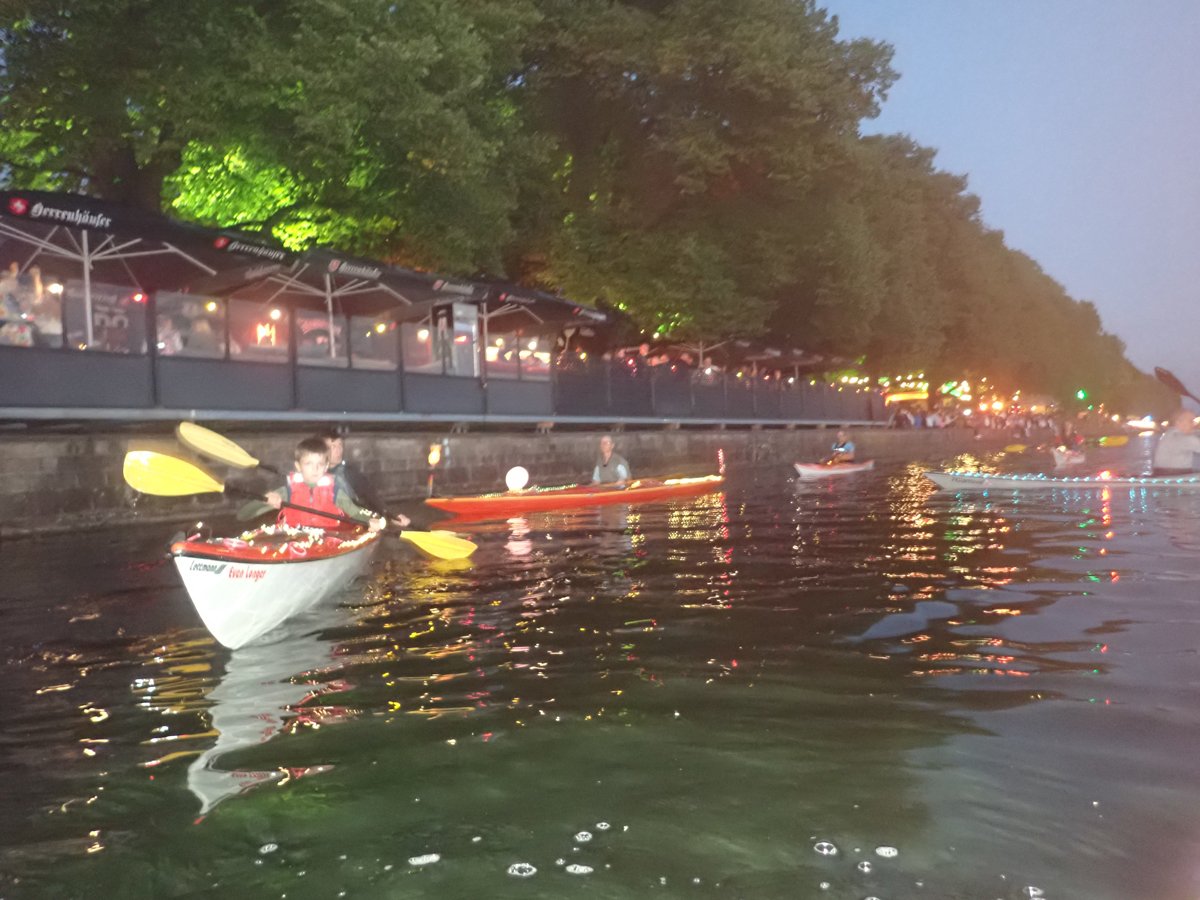 Auch in diesem Jahr besuchten wir wieder das Maschseefest - wie jedes Jahr quasi aus der allerersten Reihe, mit Kajak auf dem See. Früher reichten ein paar Knicklichter, um die Boote zu kennzeichnen und zu beleuchten. Inzwischen wird immer mehr aufgerüstet. Wasserfeste Lichterketten mit kleinen LEDs machen die Boote gut erkennbar. Auf der Rückfahrt vom Maschsee zum Bootshaus, stromaufwärts auf der Leine, sorgte ein Abend fast ohne Mond und mit vielen Wolken dann aber doch für spannende Dunkelheit.