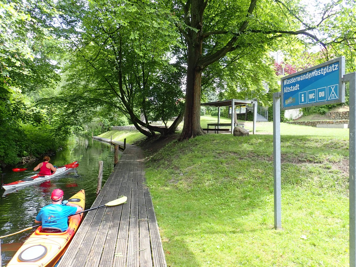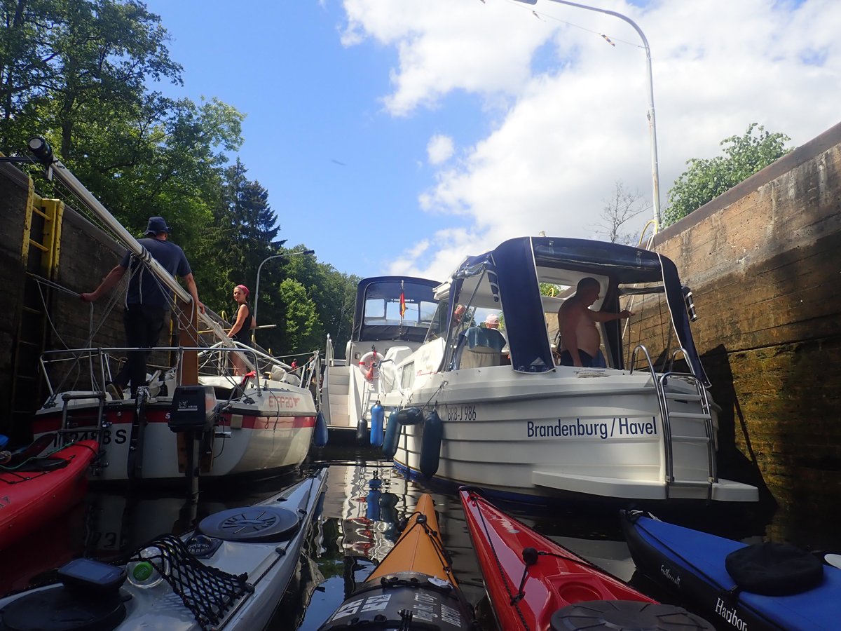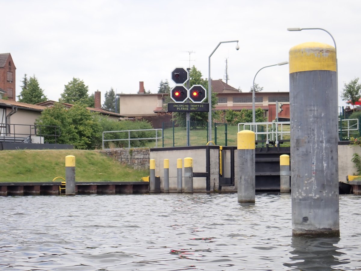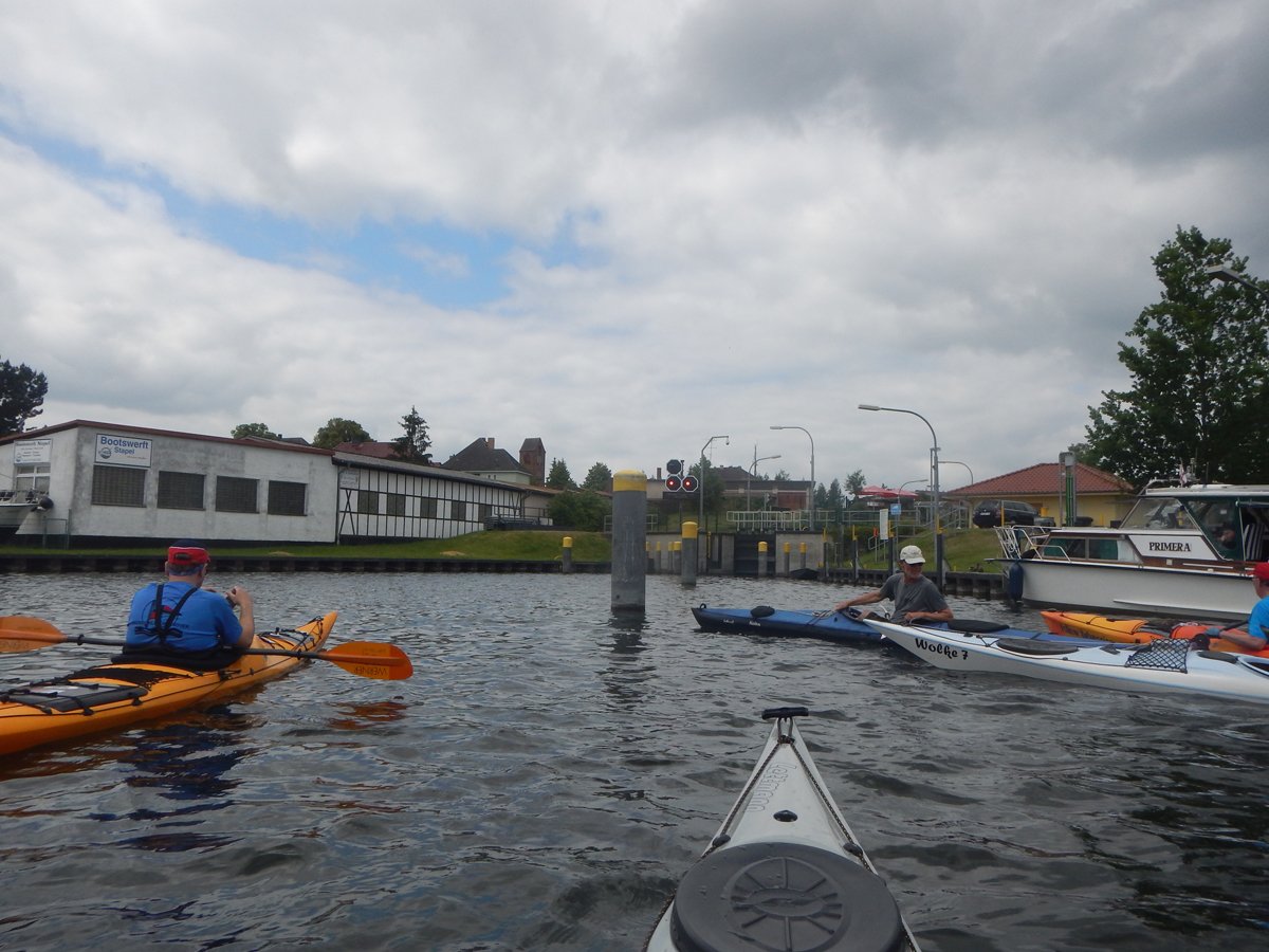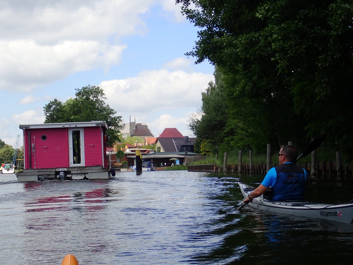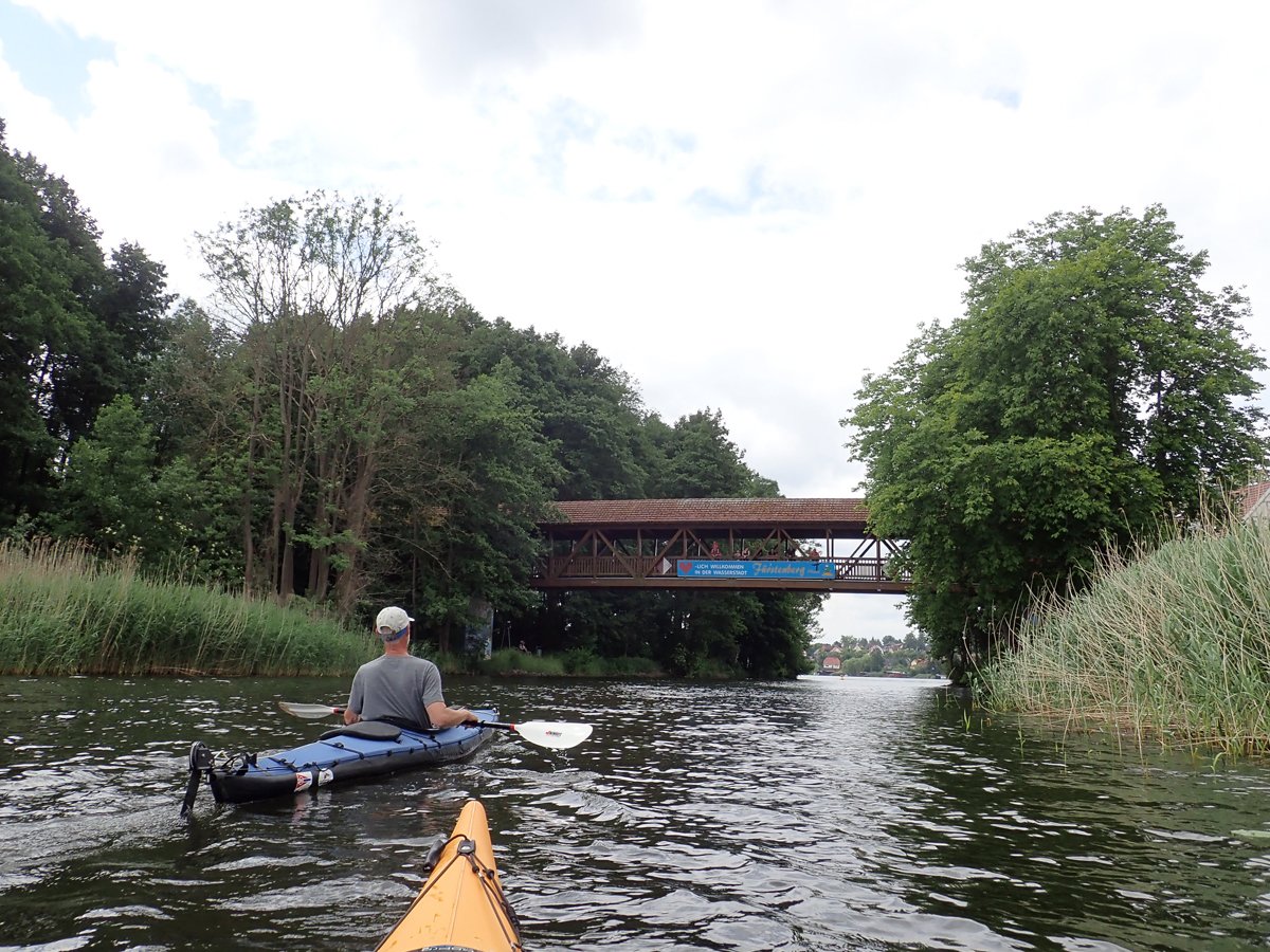 Der Start am nächsten Tag war am Wasserwanderrastplatz in Fürstenberg. Da wir die Stadt vom Wasser sehen wollten, nahmen wir nicht den kurzen Weg die Borstengasse des Wehres an der Einsetzstelle aufwärts, sondern in die andere Richtung durch den Ort. Bis zur SB-Schleuse Fürstenberg. Dort sollte uns der ansonsten lohnende Umweg fast eine Stunde Wartezeit kosten... Aber dann ging es weiter bis zu einem Flecken Land mit einer überdachten Holzbrücke und einer Verkaufsstelle eines örtlichen Fischers. Hier in Finow endete die Tour beim Fischbrötchen.