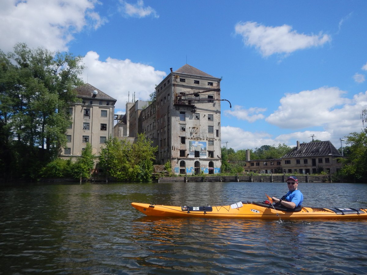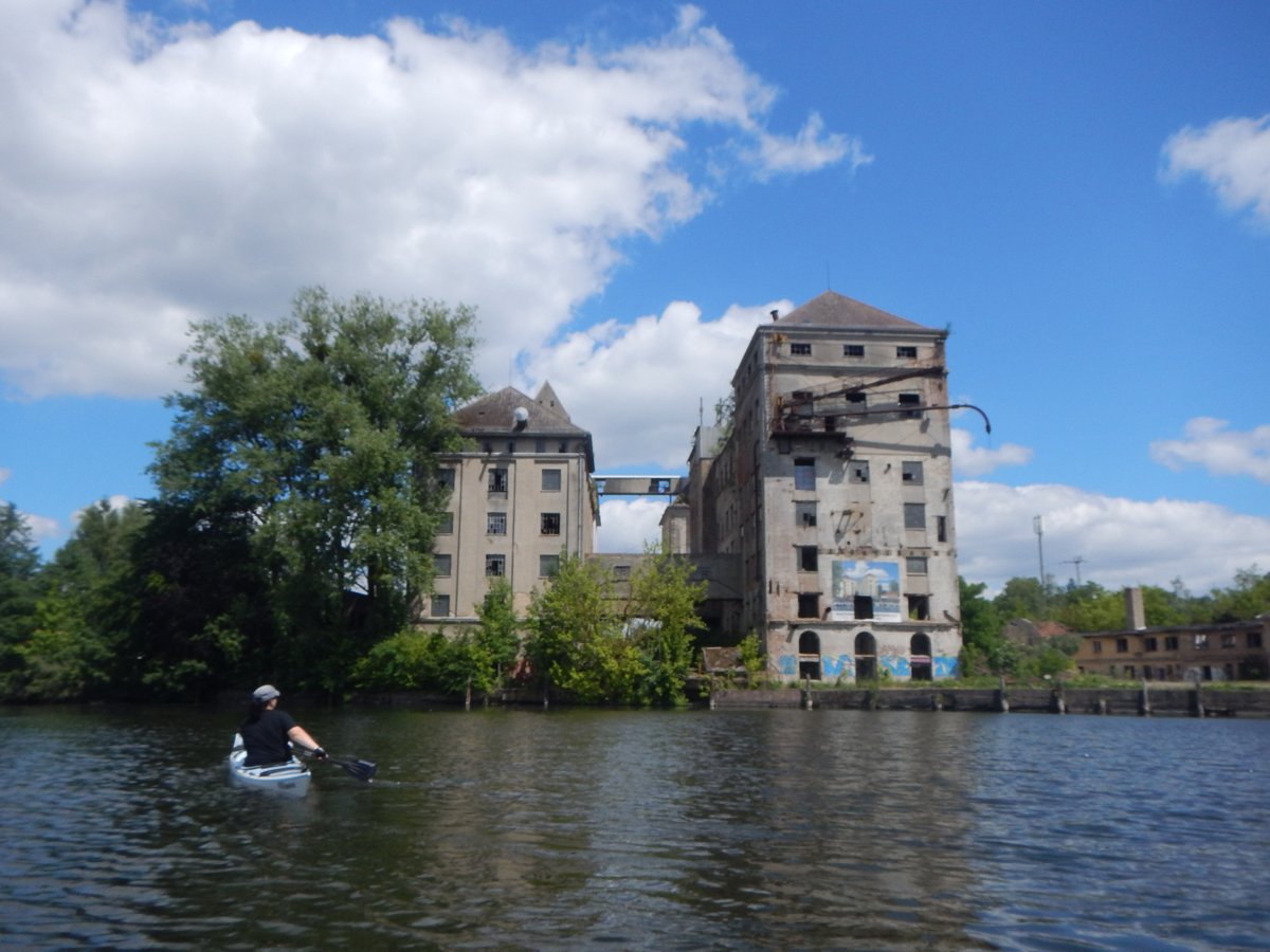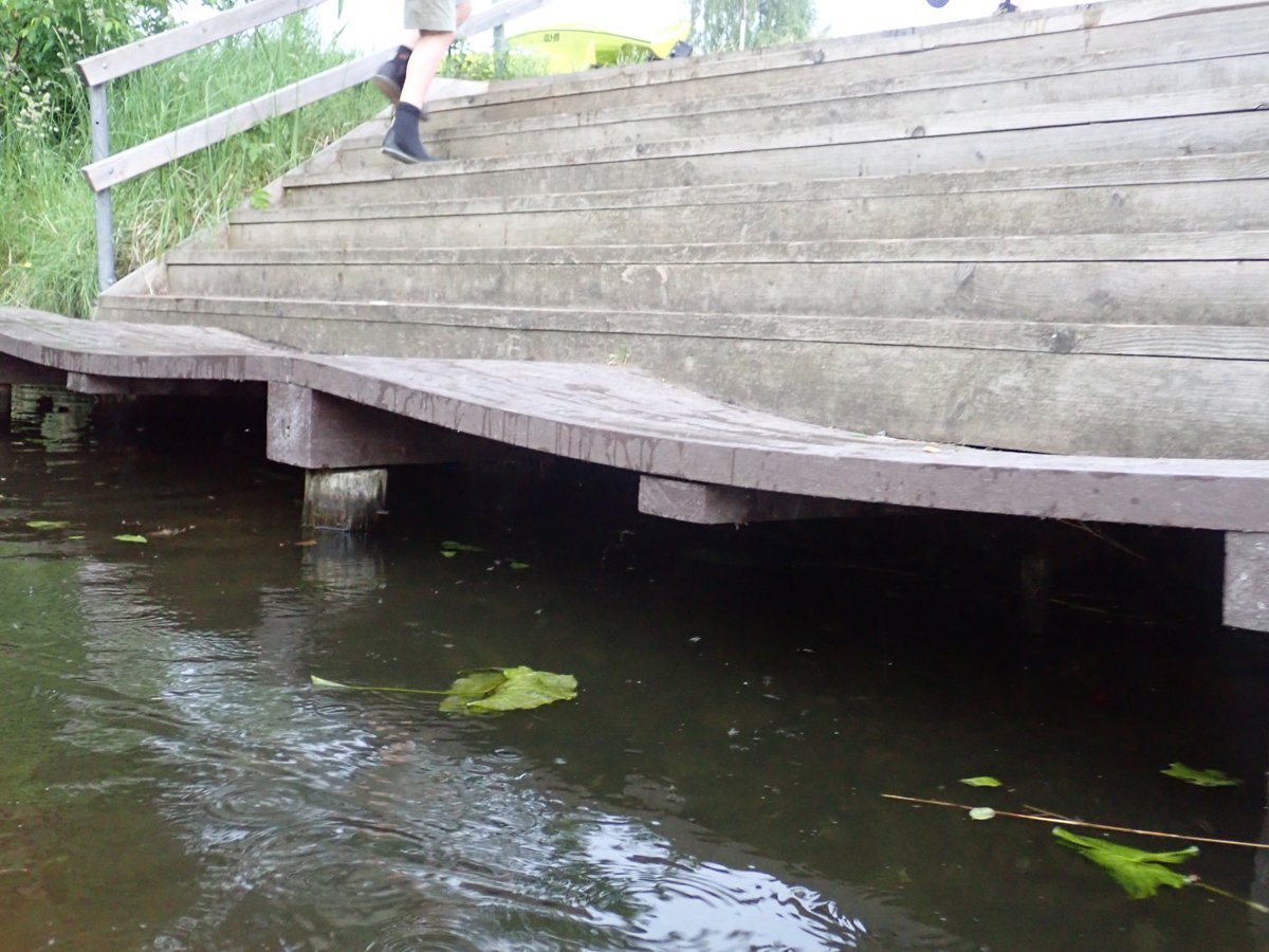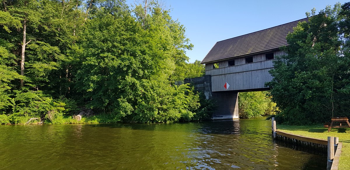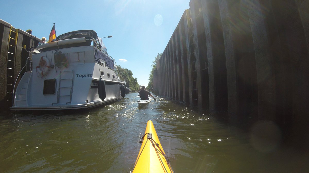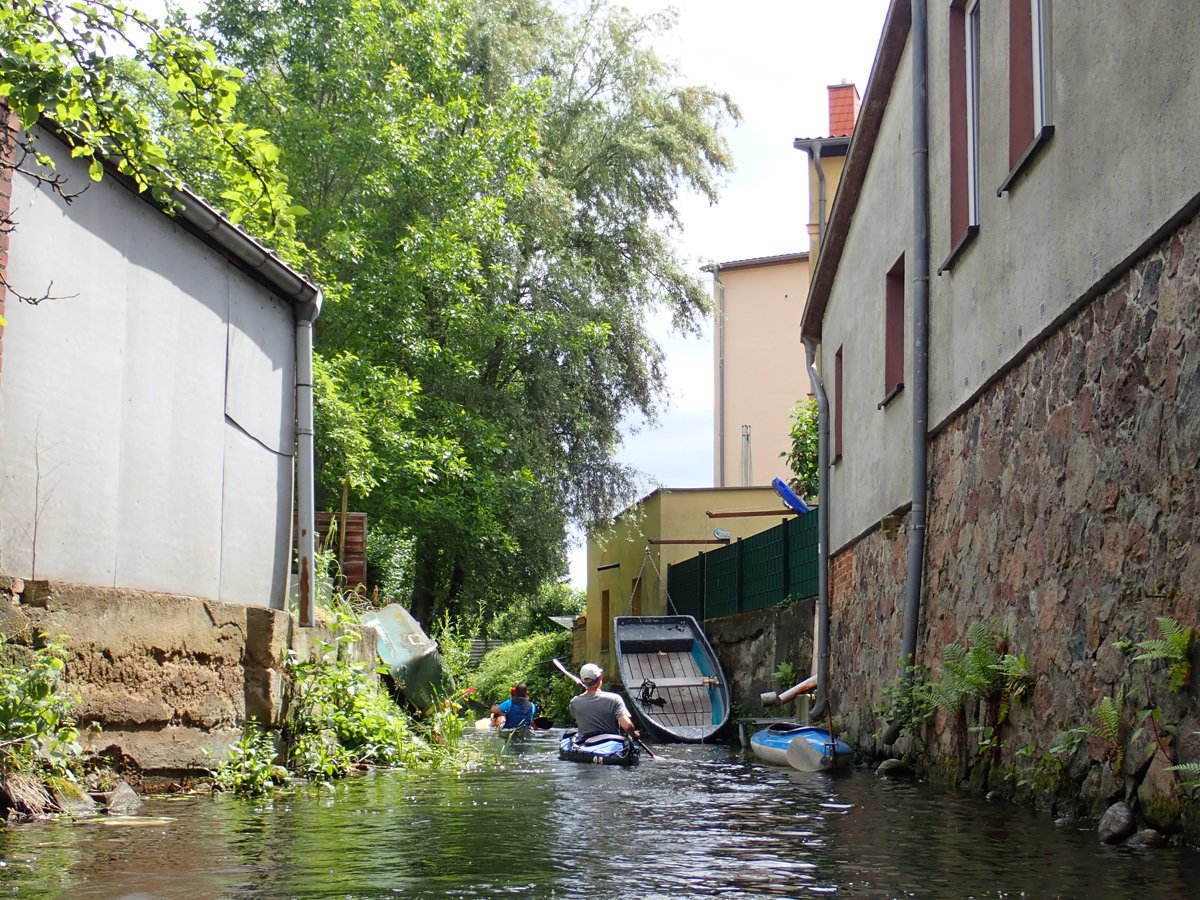 Der Start am nächsten Tag war am Wasserwanderrastplatz in Fürstenberg. Da wir die Stadt vom Wasser sehen wollten, nahmen wir nicht den kurzen Weg die Borstengasse des Wehres an der Einsetzstelle aufwärts, sondern in die andere Richtung durch den Ort. Bis zur SB-Schleuse Fürstenberg. Dort sollte uns der ansonsten lohnende Umweg fast eine Stunde Wartezeit kosten... Aber dann ging es weiter bis zu einem Flecken Land mit einer überdachten Holzbrücke und einer Verkaufsstelle eines örtlichen Fischers. Hier in Finow endete die Tour beim Fischbrötchen.