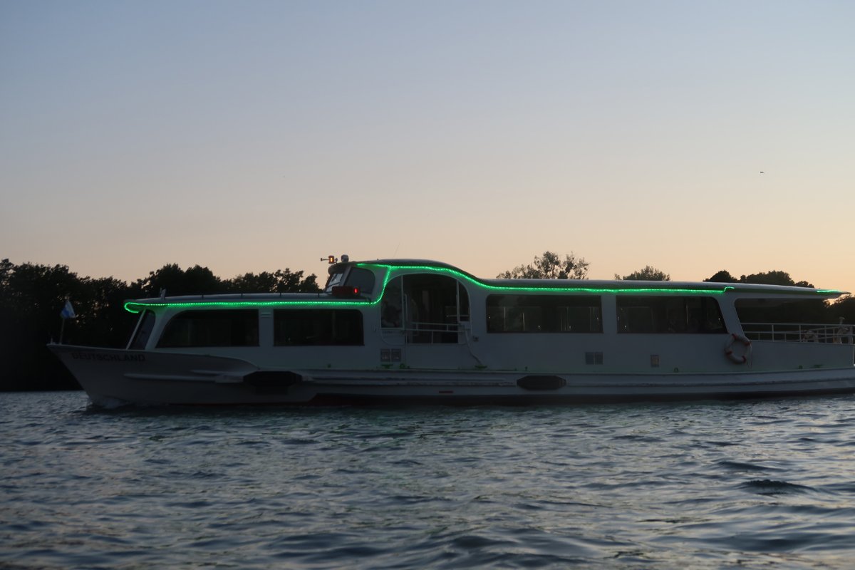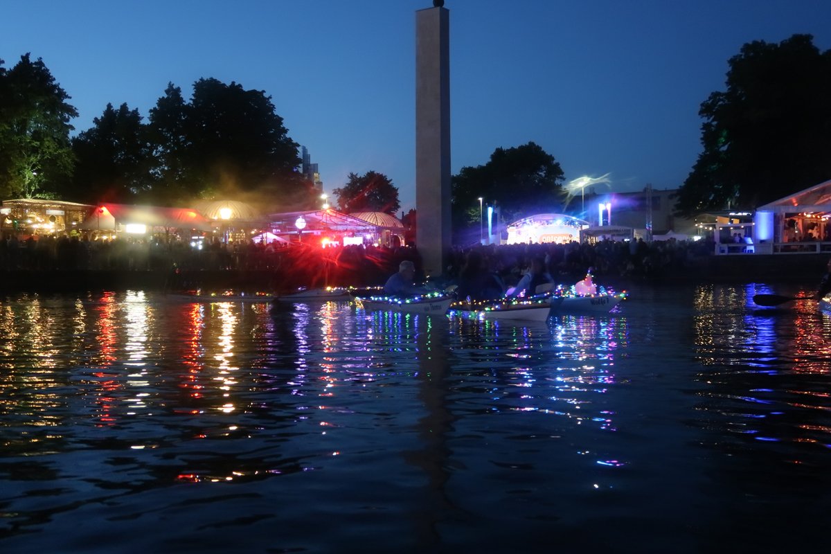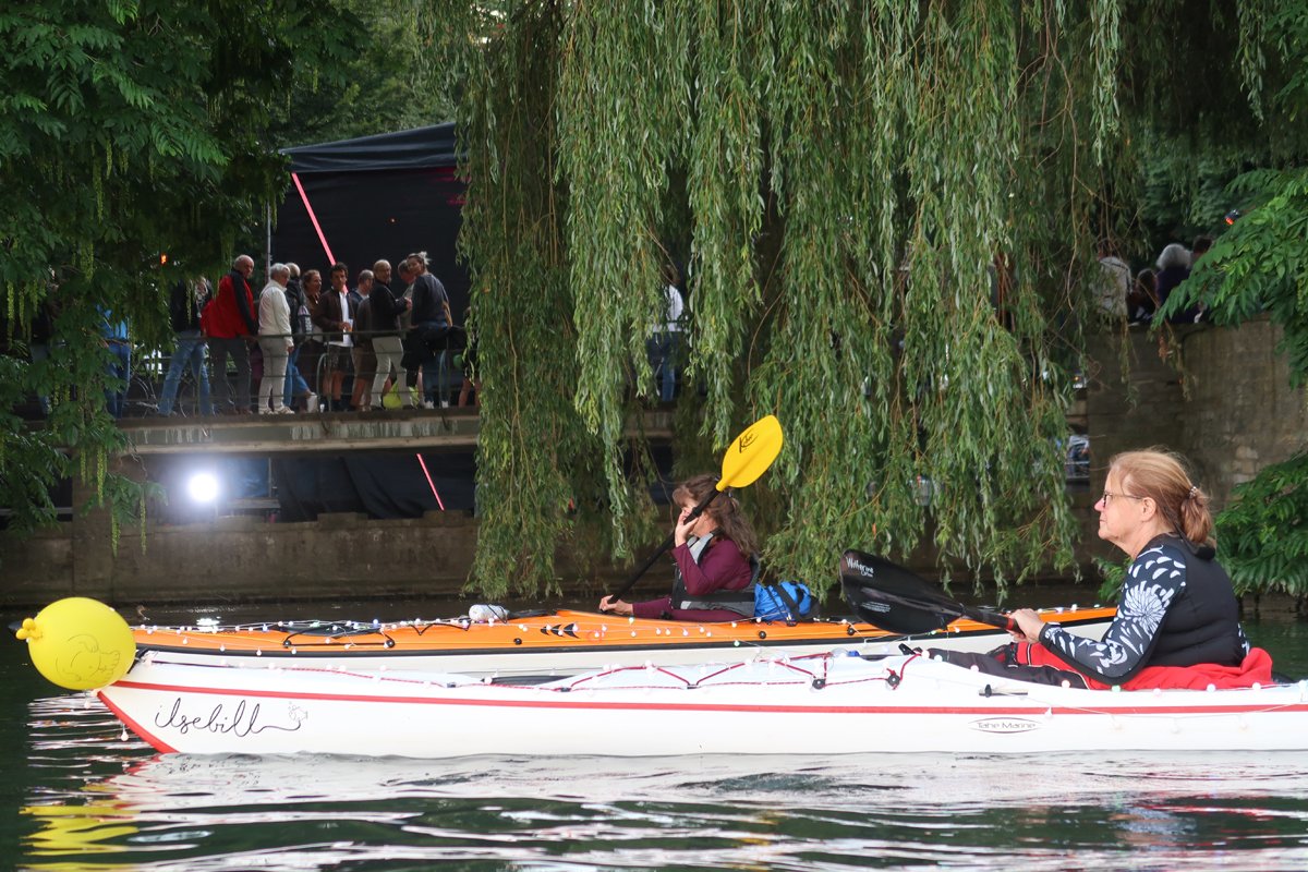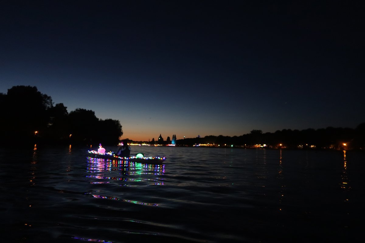 Klingt soweit, sogut ganz unspektakulär. Ist es aber nicht. Denn die Fahrt findet am Abend statt. Mit beginnender Dämmerung geht es leineabwärts, erst im Halbdunkel, dann ganz im Dunkeln über den See und später in der Nacht bei Null-Sicht auf der Leine Flussaufwärts zurück. Mit effektvoll geschmückten und beleuchteten Booten auf jeden Fall auch ein Hingucker vom Ufer aus.