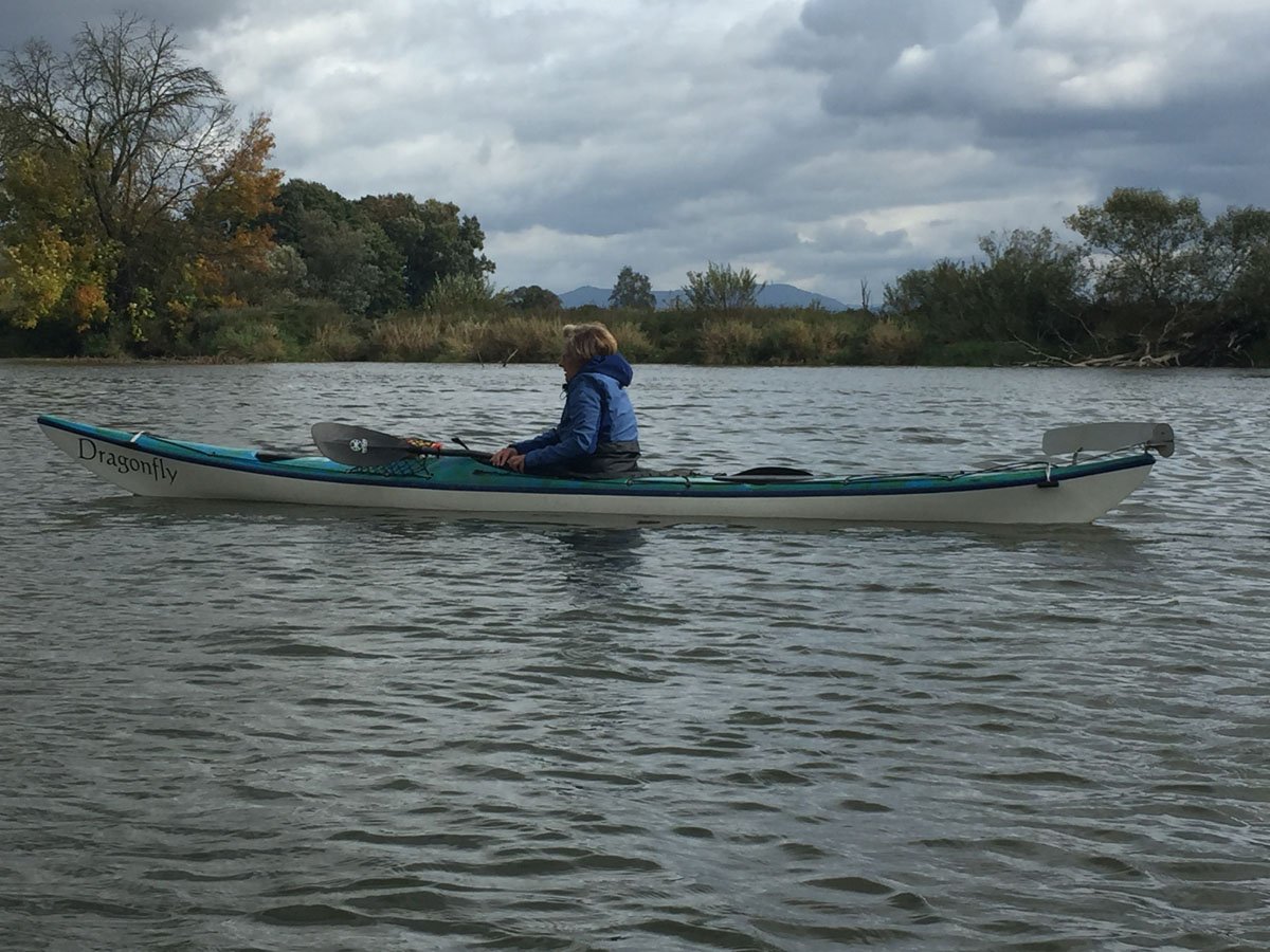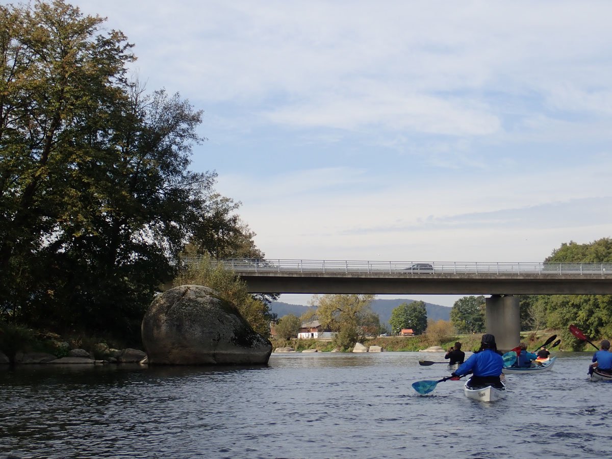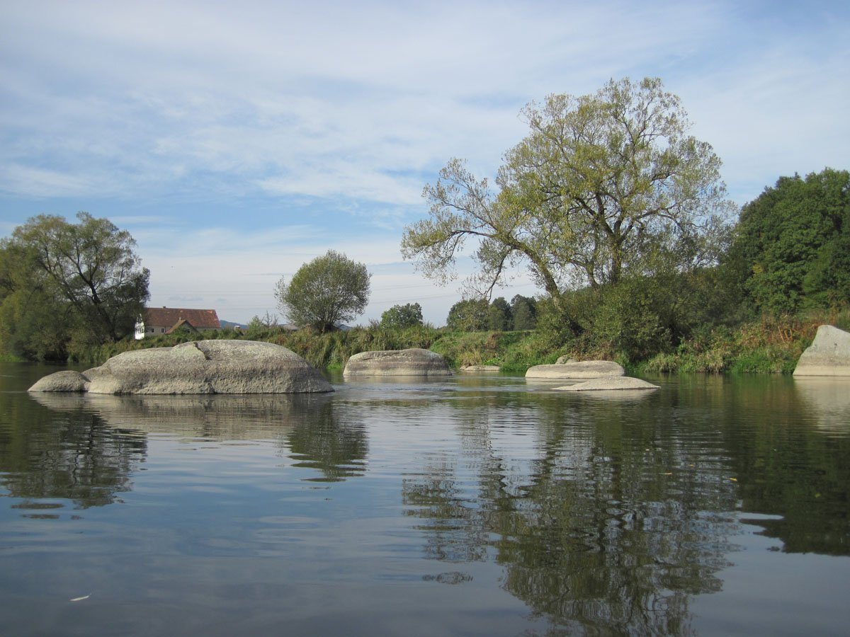 Regen: Zum Schluss folgten zwei Fahrten auf dem Regen. Die erste Regen-Tour ging von Nittenau nach Ramspau: Nur eine Umtrage, die dann aber recht lang ausfiel. Ansonsten ein grandioses Flussbild mit zahlreichen riesigen Findlingen im Bach, aber auch vielen großen Steinen dicht unter der Wasseroberfläche, so dass hier ständig absolute Aufmerksamkeit beim Paddeln angesagt war. Die zweite Tour auf dem Regen hatte einen ganz anderen Charakter: Sie führte von Cham bis Roding und war eine Fahrt durch das größte bayrische Naturschutzgebiet, in dem der Fluss weitestgehend frei mäandieren kann. Inklusiver vieler kleiner Inseln im Fluss und Aufteilung auf kleine Flussarme ergab sich eine interessante Fahrt ganz ohne Wehre.