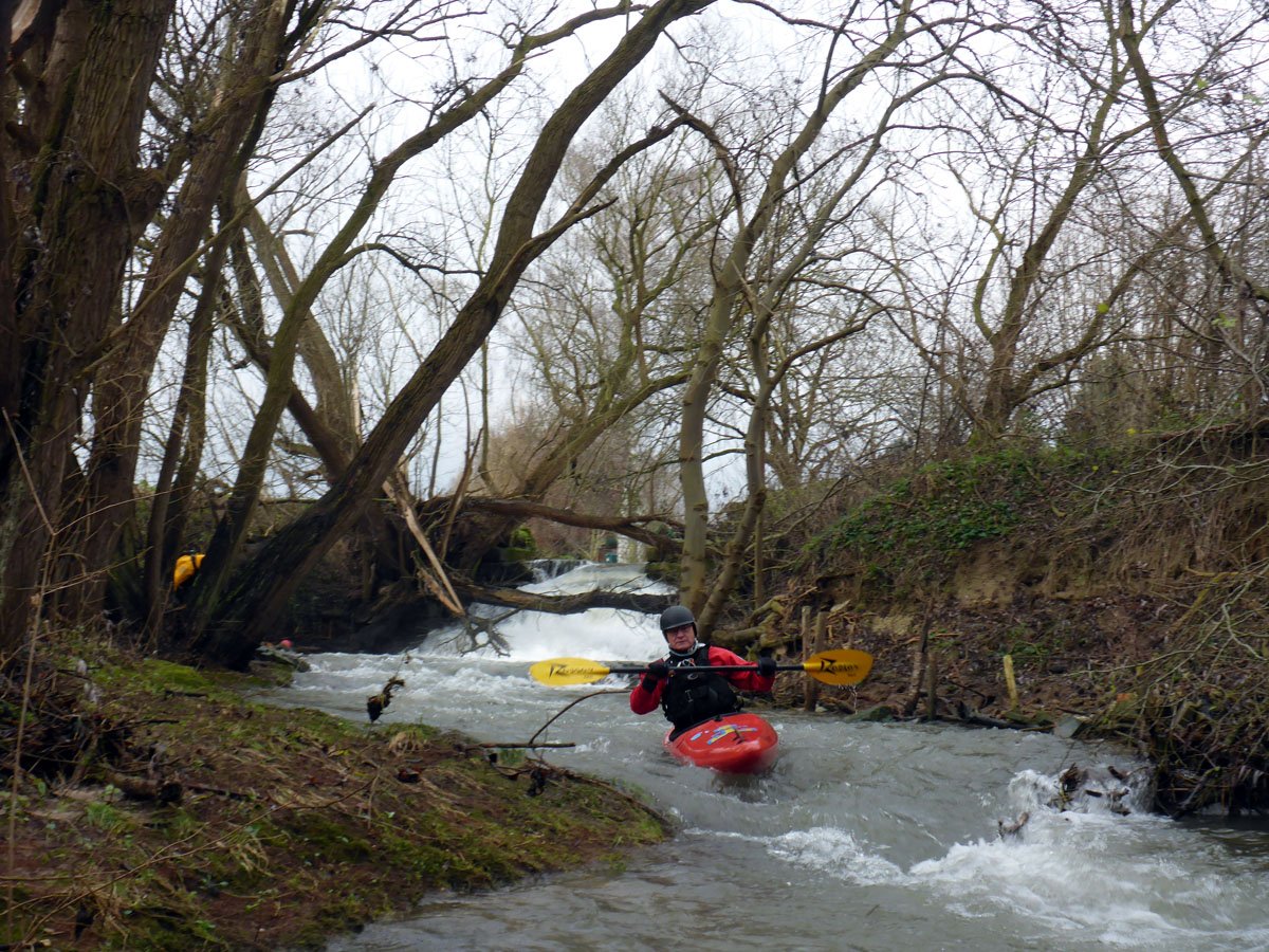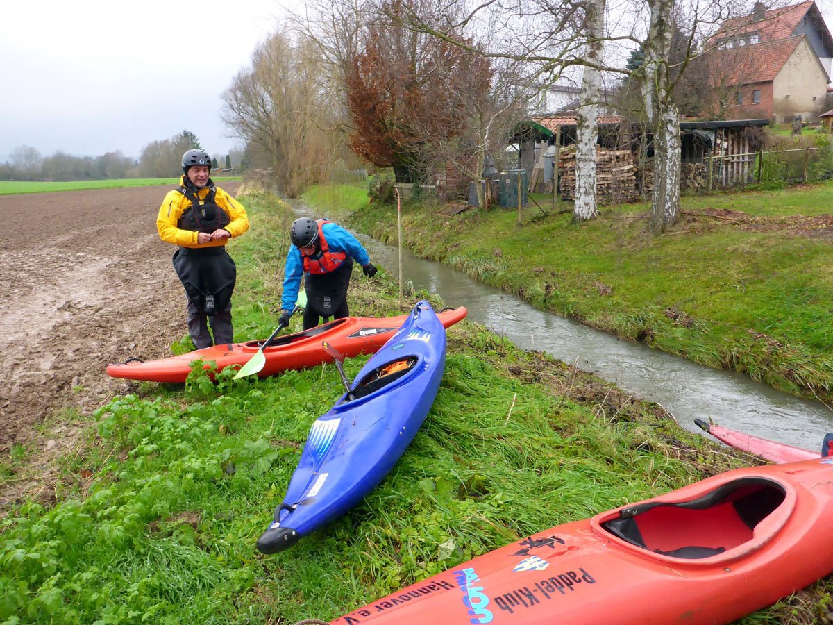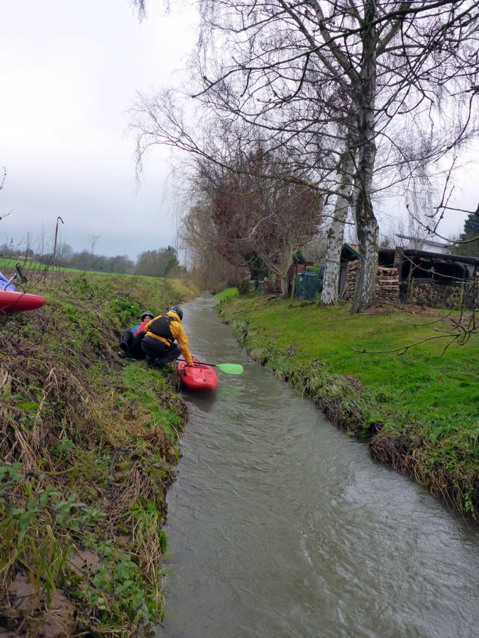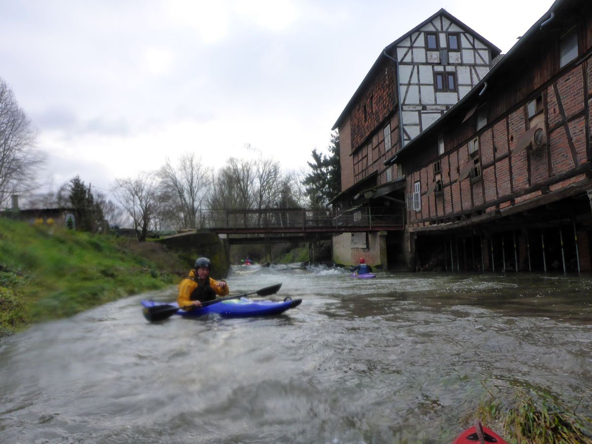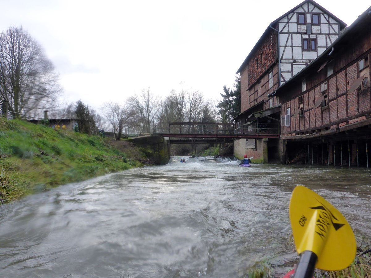 Ja, es ist möglich: 13 Kilometer paddeln und dabei 4 verschiedene Flüsse befahren - auch außerhalb des Spreewald-Labyrinths. Man nehme: Viel Wasser nach langen Niederschlägen und in der ohnehin wasserreichen Winterzeit, komplette kleinflusstaugliche Ausrüstung inkl. ausreichend kurzer Boote. Einige Gewässer sind weniger breit als ein Kajak lang ist. Man rechne mit oder plane ein: Nötiger Ausdauer, vielen Wehren, schlecht zugänglichem Gelände, noch mehr Wehren und allen denkbaren Kleinflusshindernissen bei durchweg zügiger Strömung durch hohe Wasserstände des ablaufenden Hochwassers. Heraus kommt eine sportlich-spannende Tour, die so nur selten möglich ist. So selten, das Alme und Riehe noch nicht einmal genau im Paddler-Standardwerk, dem DKV-Gewässerführer, beschrieben sind, sondern nur als Randnotiz auftauchen. Das macht es dann gleich zu etwas ganz besonderem, kommt doch noch eine Spur Expeditionscharakter direkt vor der Haustür dazu.